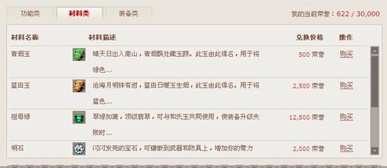 竞技场中获得的荣誉,可以在这里换购各种功能和物品。可以利用荣誉兑换经验和金钱,同时还可以换取某些稀有强化材料和稀有铸造材料。 职位越高,能够在这里看见的东西也越多、越高级;荣誉越多,可以换购到的物品也越多、越好。