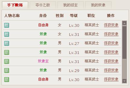 当你在竞技场或在武馆战中战胜一个等级差别不超过5级的对手后,他的名字就会出现在【奴隶市场】中的“手下败将”里面。如果你是个奴隶主,或者是自由身,就可以在这里再次挑战他,此次挑战如果胜利,他就是你的奴隶了!
