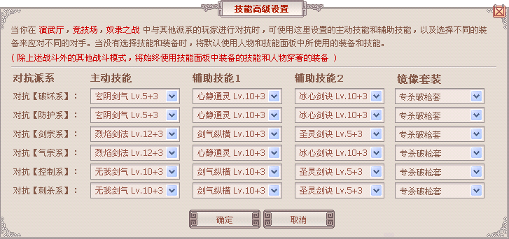 2) 在演武厅,竞技场,奴隶之战的战斗模式下,对抗6种不同职业时,可选择主动技能与辅助技能外,还可选择使用哪套镜像套装